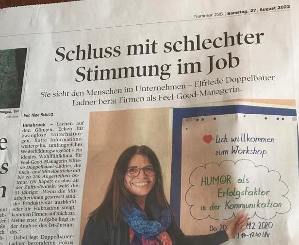 Die Tiroler Tageszeitung berichtet über FEEL-GOOD Management in Unternehmen. Ist das ein neuer Trend oder eine Notwendigkeit? Warum lohnt es sich, das Wohlbefinden der Mitarbeiter im Auge zu haben? Wie wirkt sich die Zufriedenheit der Mitarbeiter auf Kunden und den Erfolg eines Unternehmens aus? Im Interview: die erste FEEL-GOOD Managerin Tirols, Elfriede Doppelbauer